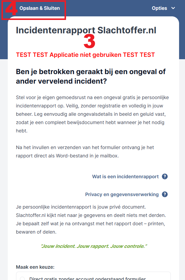 Je stelt jouw rapport vrijblijvend en zonder verplichtingen op — veilig, privé en alleen voor jouw eigen gebruik. Wil je jouw gegevens liever niet online invullen? Download dan ons blanco incidentenrapport en vul het eenvoudig met pen in!